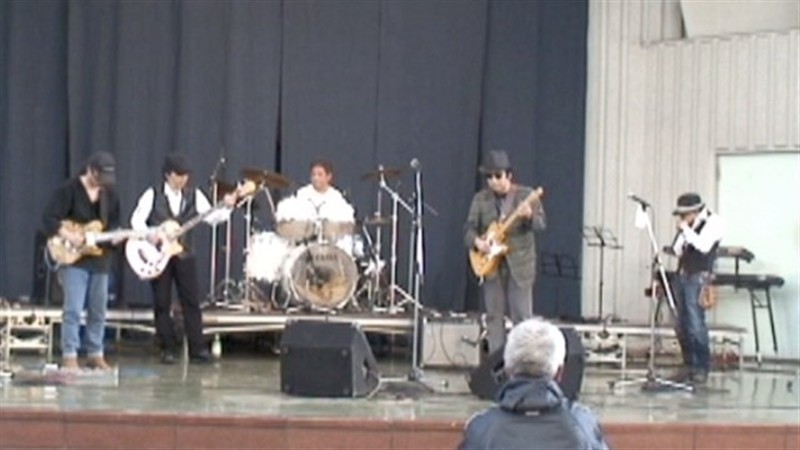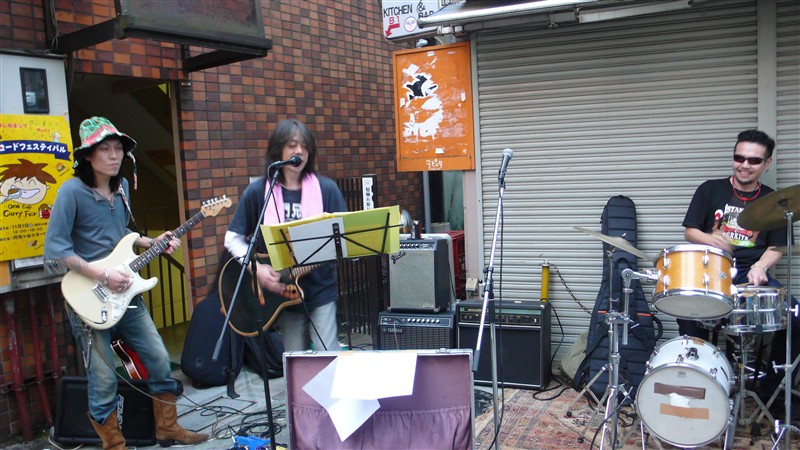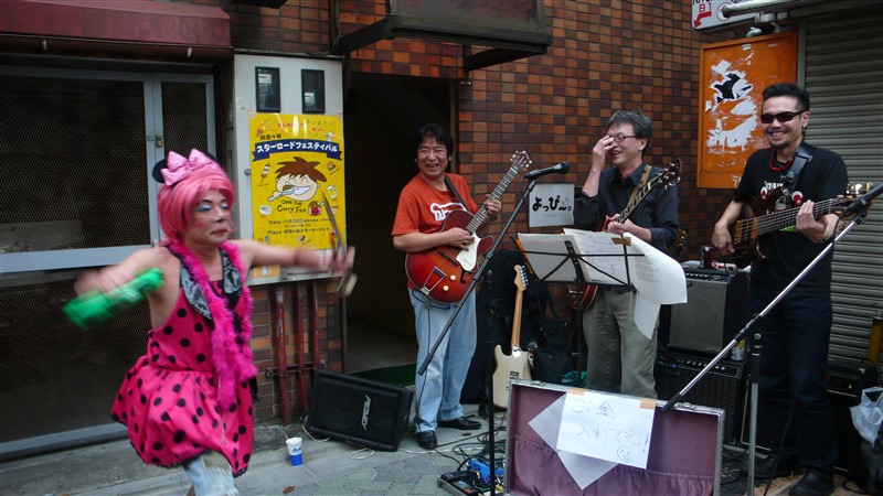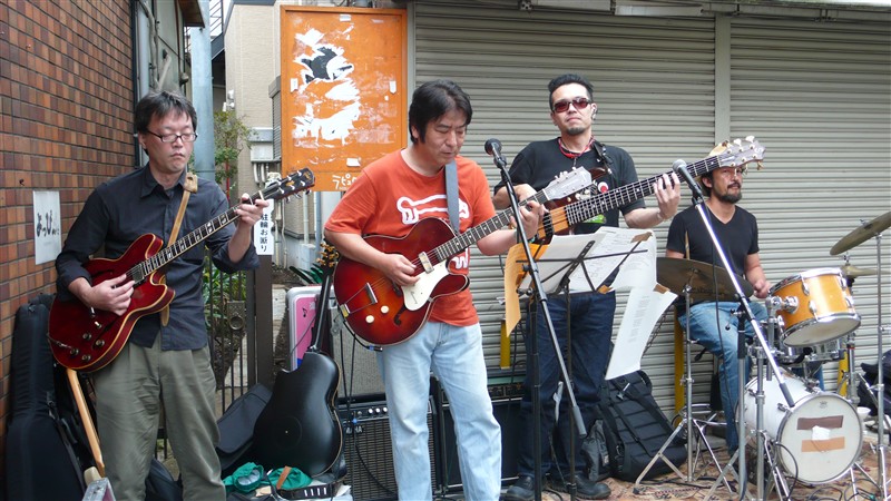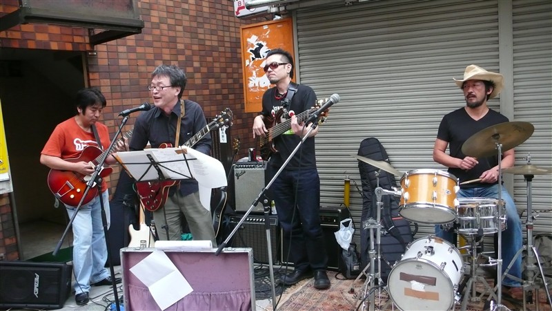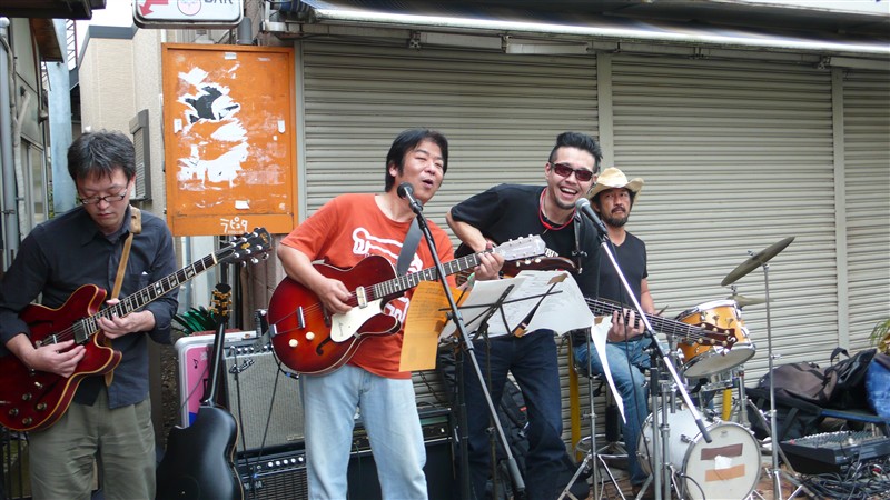 スターロード突き当りの、酒屋前特設ステージのメインは、小安田憲司さんを筆頭に、Shine-A-Lites の木村聡さん、Sun Alley などで活躍の売れっ子ベーシスト 江口弘史さん、ドラムは阿佐ヶ谷界隈のライブではお馴染みの 小田智昭さん。