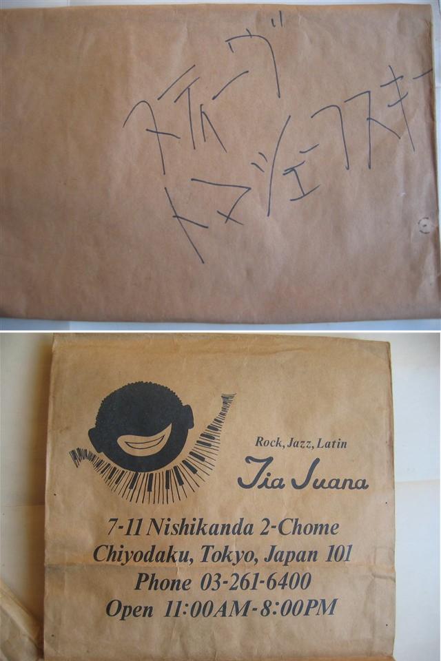 デルマーク・レコード(Delmark)の重鎮、スティーブ・トマシェフスキー氏のサイン。ジョン・リトルジョン来日の時に貰ったような気がするが、記憶が定かではない。ひょっとしたら、ロウエル・フルソンの時かもしれない。親日家のスティーブ氏。ちゃっかり日本語のサイン。上記、スリム・ゲイラードさん同様に、子供の落書きではありません。ちなみに、西荻窪にあったレコード店、ティア・ホアナ(一部では異常に有名なお店でした。私の溜まり場でもありました。)の袋(この袋も貴重?)の裏に書いていただいた。